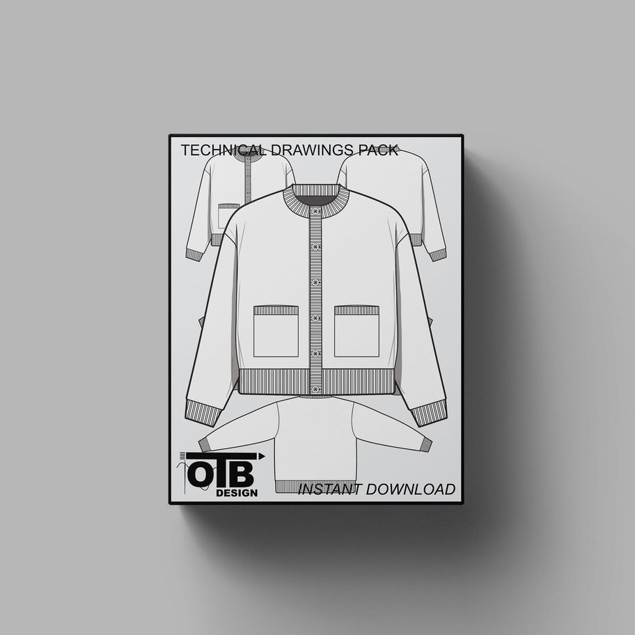 Oversized Round Neck Cardigan Sweater Flat Vector Technical Drawing